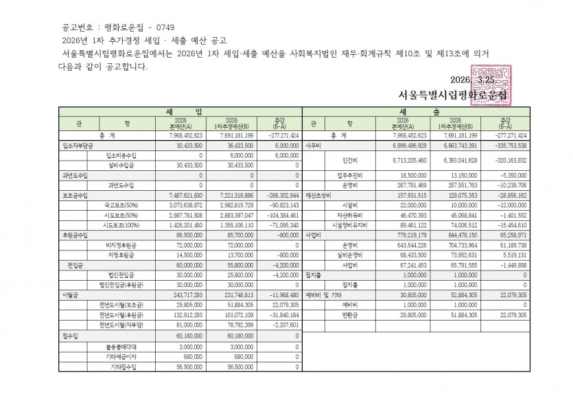 2026년 1차 추가경정 예산 공고 페이지 정보 작성자 한동주 작성일 26-03-25 16:51 조회 47회 댓글 0건 첨부파일 파일 홈페이지공고 .pdf (75.1K) 3회 다운로드 DATE : 2026-03-25 16:51:20 본문 이전글 다음글 목록 답변