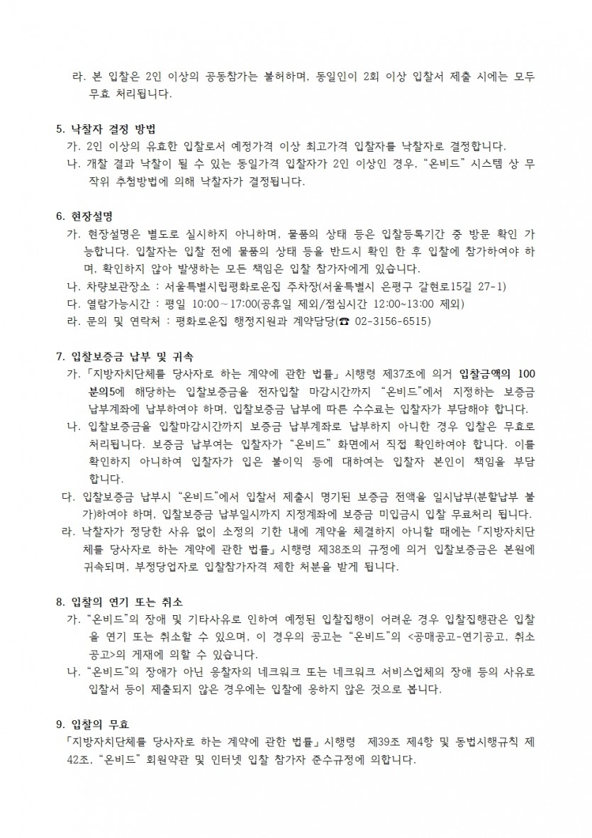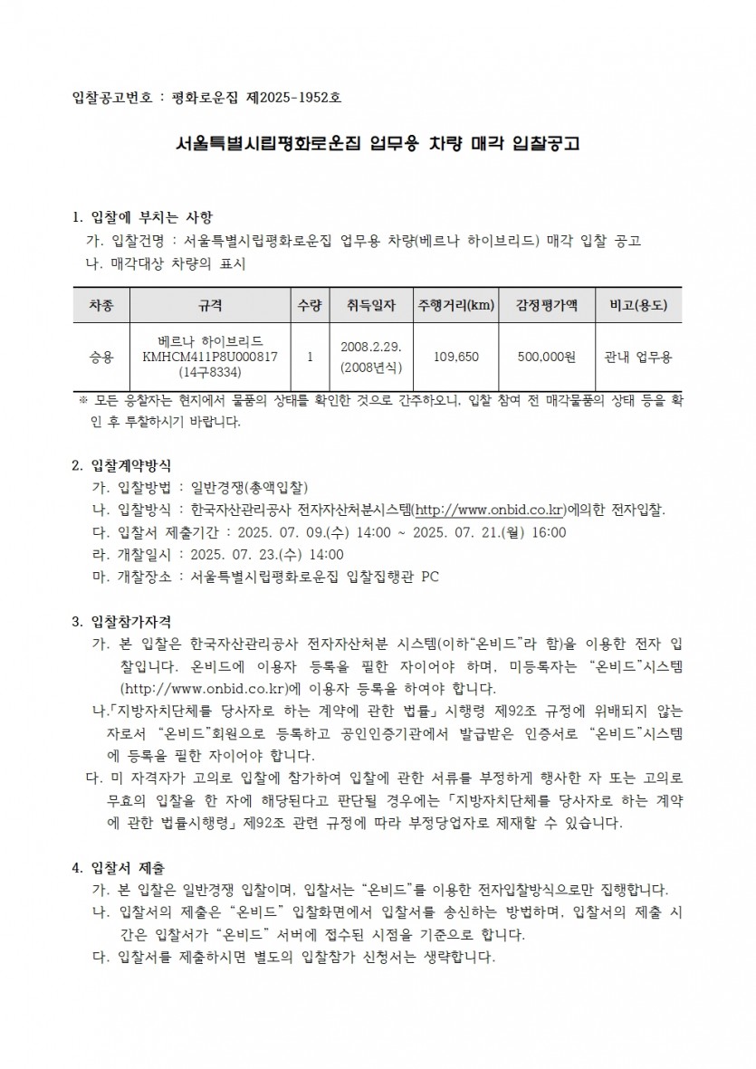 업무용 차량 매각 한국자산관리공사 전자자산처분시스템(온비드) 입찰공고 페이지 정보 작성자 한동주 작성일 25-07-09 11:45 조회 8,525회 댓글 0건 첨부파일 파일 입찰공고서_온비드_차량매각_공고문.hwp (70.5K) 91회 다운로드 DATE : 2025-07-09 11:45:50 본문 이전글 다음글 목록 답변