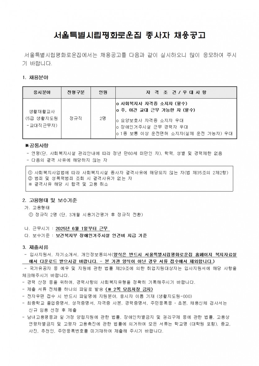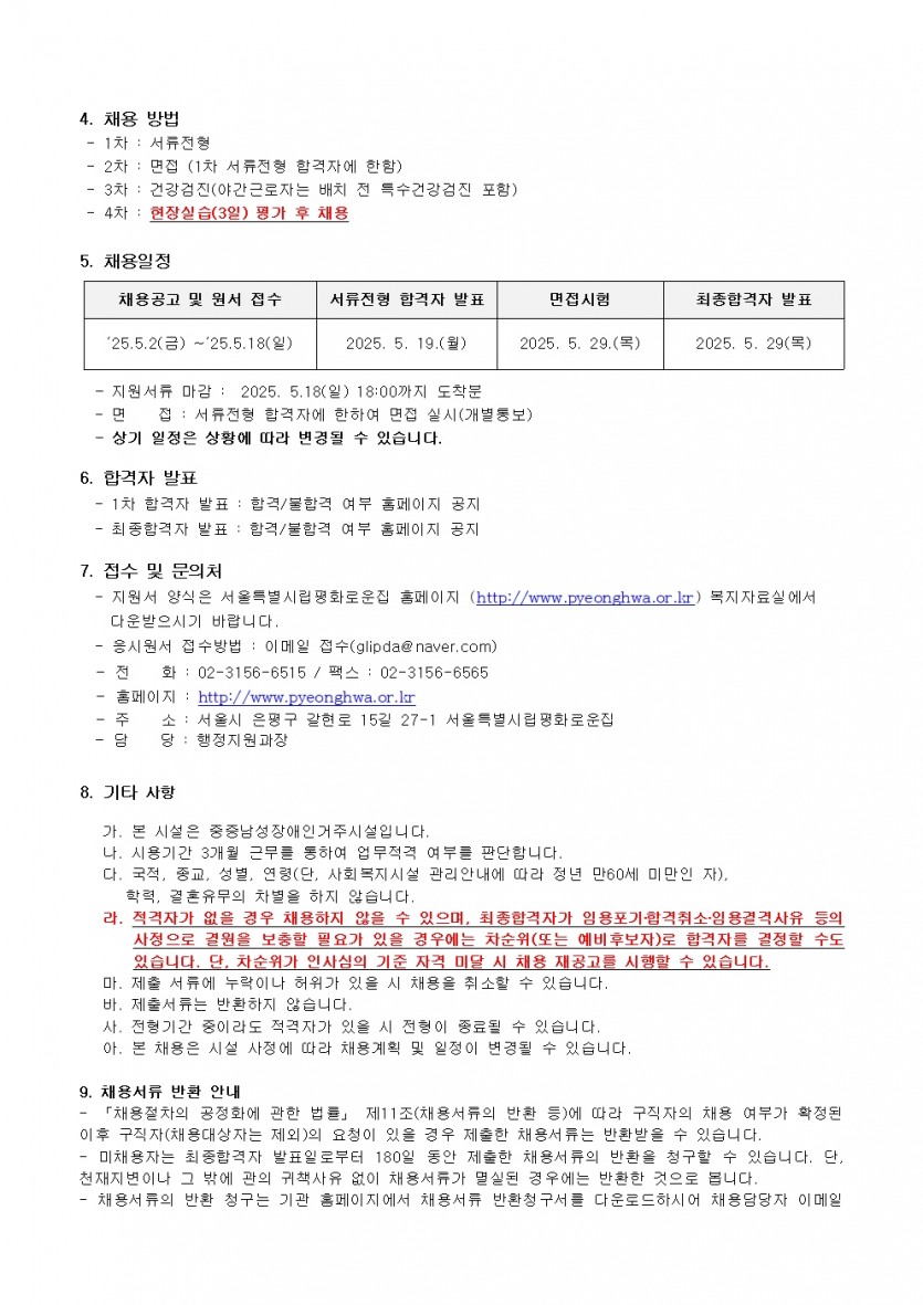 평화로운집 2025년 3차 종사자(생활지도원) 채용 공고 페이지 정보 작성자 한동주 작성일 25-05-02 14:08 조회 11,066회 댓글 0건 첨부파일 파일 2025년-생활지도원 3차.hwp (114.5K) 97회 다운로드 DATE : 2025-05-02 14:08:29 파일 시립평화로운집 입사지원서이력서,자기소개서및개인정보동의서.hwp (54.0K) 149회 다운로드 DATE : 2025-05-02 14:08:29 본문 평화로운집 2025년 3차 종사자(생활지도원) 채용을 다음과 같이 공고합니다. 이전글 다음글 목록 답변