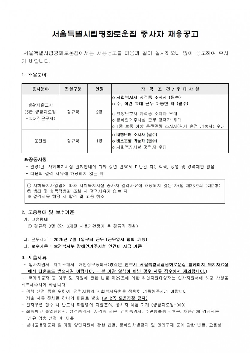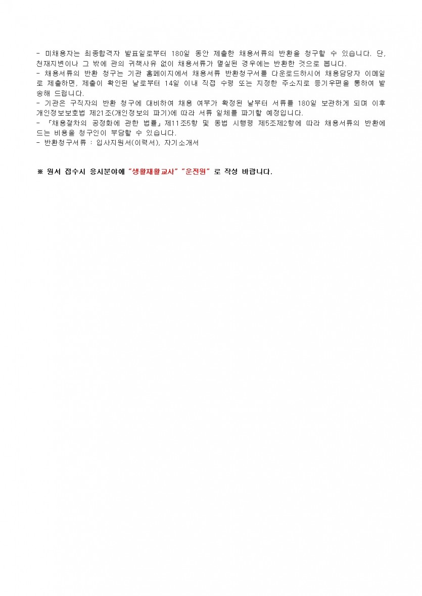 제4차 직원채용 공고(생활지도원, 운전원) 페이지 정보 작성자 한동주 작성일 25-06-04 13:54 조회 10,126회 댓글 0건 첨부파일 파일 시립평화로운집 입사지원서이력서,자기소개서및개인정보동의서.hwp (54.0K) 159회 다운로드 DATE : 2025-06-04 13:54:21 파일 2025년 4차 운전원, 생활지도원.hwp (117.5K) 131회 다운로드 DATE : 2025-06-04 16:44:36 본문 이전글 다음글 목록 답변