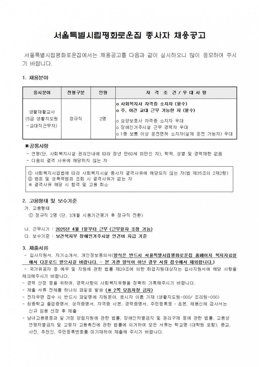 제2차 서울특별시립평화로운집 종사자 채용공고 페이지 정보 작성자 한동주 작성일 25-03-01 10:04 조회 13,481회 댓글 0건 첨부파일 파일 2025년-생활지도원 2차.hwp (58.5K) 154회 다운로드 DATE : 2025-03-01 10:07:51 파일 시립평화로운집 입사지원서이력서,자기소개서및개인정보동의서.hwp (54.0K) 188회 다운로드 DATE : 2025-03-01 10:07:51 본문 이전글 다음글 목록 답변