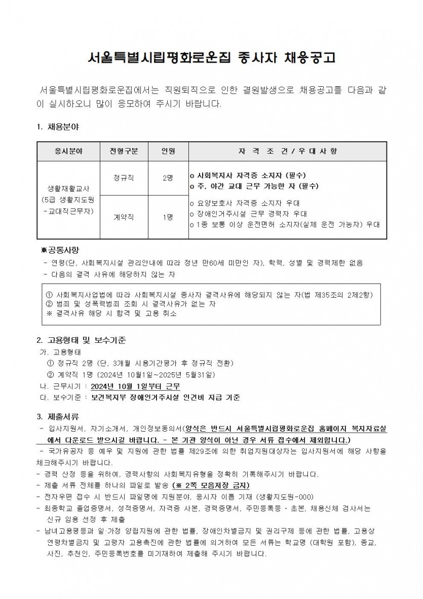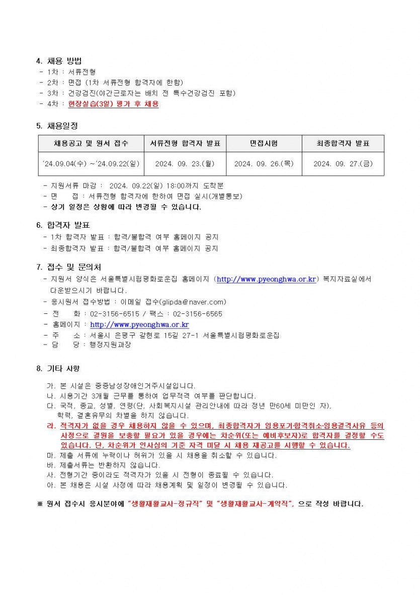 2024년 제9차 종사자 채용 모집공고 페이지 정보 작성자 한동주 작성일 24-09-04 17:18 조회 17,876회 댓글 0건 첨부파일 파일 시립평화로운집 입사지원서이력서,자기소개서및개인정보동의서.hwp (22.5K) 132회 다운로드 DATE : 2024-09-04 17:18:55 파일 2024년-생활지도원 9월.hwp (36.5K) 109회 다운로드 DATE : 2024-09-04 17:18:55 본문 이전글 다음글 목록 답변