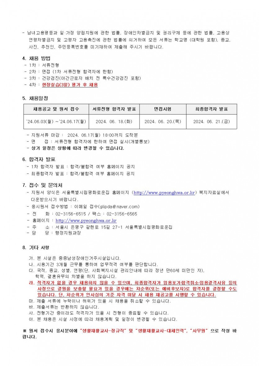 2024년 평화로운집 6차 직원채용 공고 페이지 정보 작성자 한동주 작성일 24-06-03 13:16 조회 18,876회 댓글 0건 첨부파일 파일 시립평화로운집 입사지원서이력서,자기소개서및개인정보동의서.hwp (22.5K) 188회 다운로드 DATE : 2024-06-03 13:16:55 파일 2024년-생활지도원사무원-6월.hwp (36.5K) 126회 다운로드 DATE : 2024-06-03 13:35:52 본문 2024년 평화로운집 6차 직원채용 공고를 다음과 같이 공지하오니 관심있는 분들의 많은 참여 부탁드립니다. 이전글 다음글 목록 답변