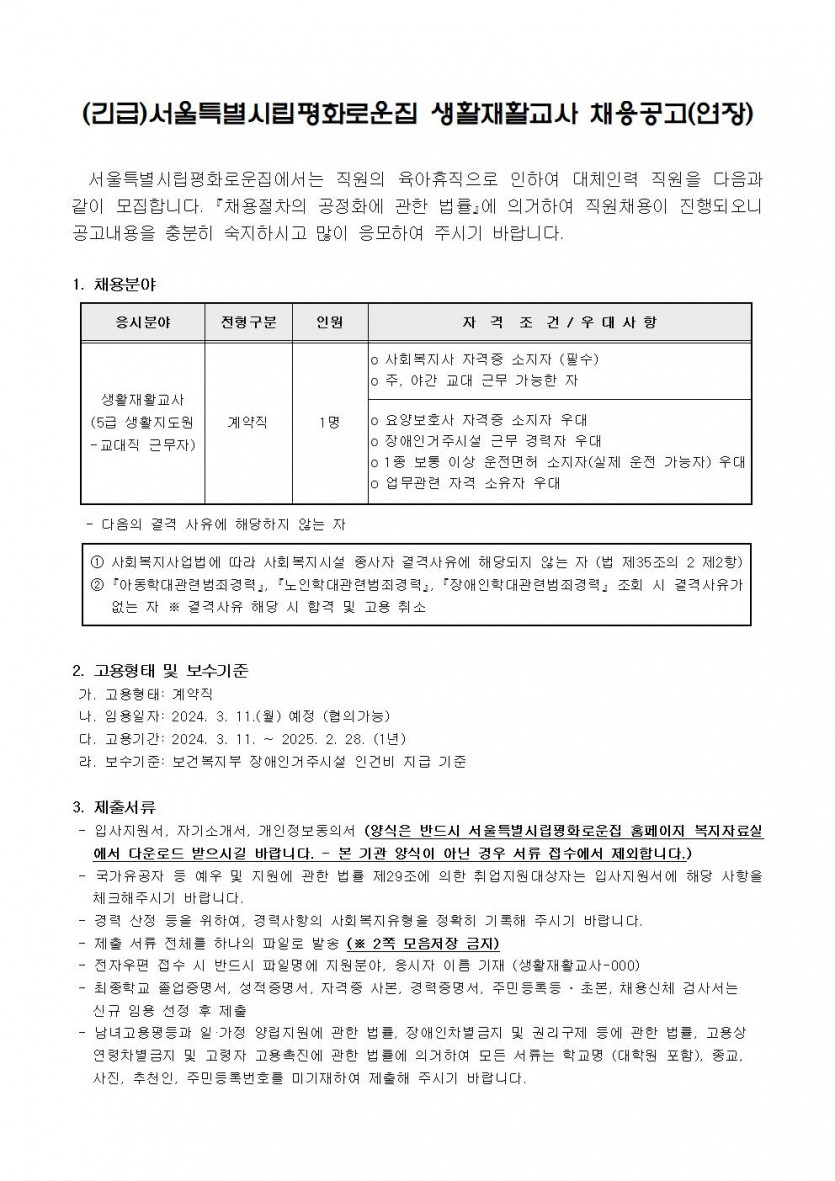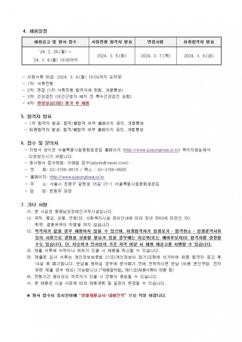 (긴급)서울특별시립평화로운집 생활재활교사 채용공고(연장) 페이지 정보 작성자 한동주 작성일 24-02-26 14:43 조회 20,161회 댓글 0건 첨부파일 파일 시립평화로운집 입사지원서이력서,자기소개서및개인정보동의서.hwp (22.5K) 143회 다운로드 DATE : 2024-02-26 14:43:58 본문 이전글 다음글 목록 답변
