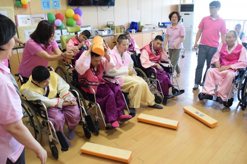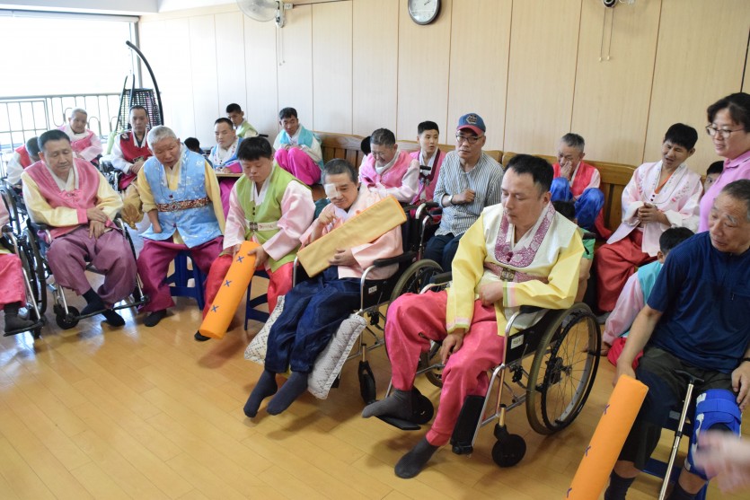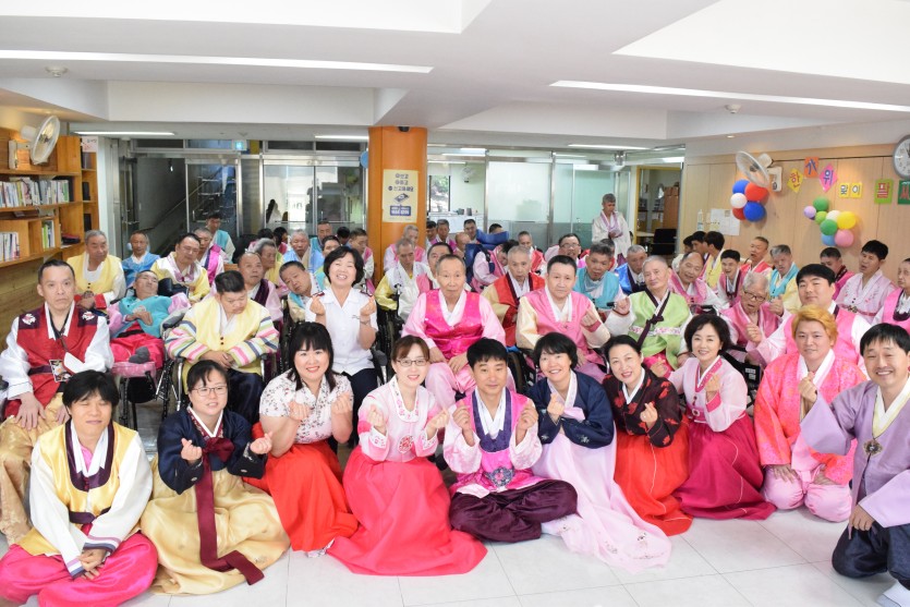 아침부터 거주 장애인뿐 아니라 직원들 모두 한복으로 갈아입고, 추석명절을 맞이하였습니다.