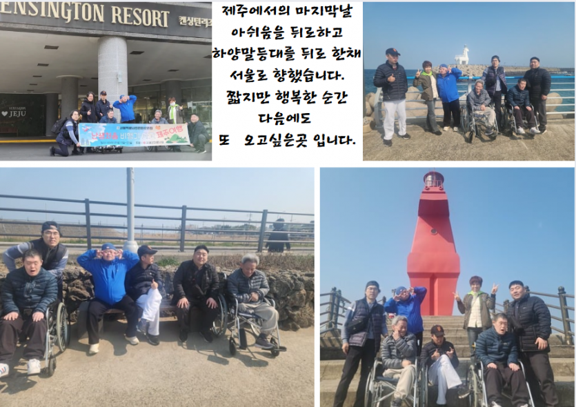 거주인 이야기 | "난생처음 비행기 타고" 제주 2차 여행 페이지 정보 작성자 장설궁 작성일 25-03-25 11:21 조회 5,659회 댓글 0건 본문 오늘은 선물입니다. 선물같았던 2박3일의 제주여행마음껏 즐기고... 감사하는 마음으로 보냈습니다. 특별한 날이 될 수 있도록 만들어 주심에 감사의 마음을 전합니다. 이전글 다음글 목록