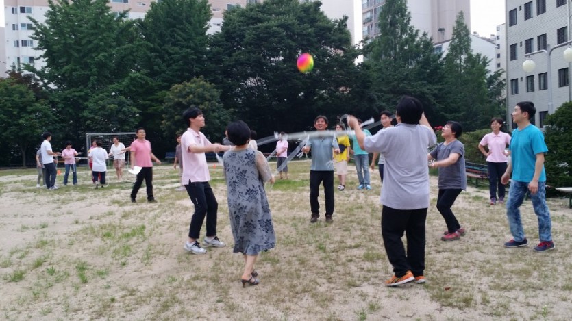 서로의 마음을 합쳐서 공동체의 단합을 나타낼 수 있는 공 원반에 튕겨 올리기