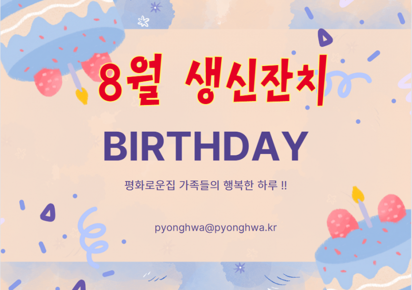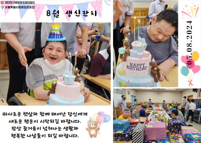 거주인 이야기 | 2024년 8월 생신잔치 페이지 정보 작성자 장설궁 작성일 24-08-07 17:38 조회 7,410회 댓글 0건 본문 평화로운집 생신 가족이 가장 많은 두 달 중 8월 생신잔치를 진행 하였습니다생신을 축하하기 위해 준비한 다양한 음식을 나누며 생신 케이크에 촛불을 밝히고 모두가 함께 생일 노래를 부르며축하하는 시간을 보냈습니다.무더운 날씨 속에서도 건강을 잃지 않도록 유의하시고,시원한 바람과 함께 여유로운 시간 보내세요~ 이전글 다음글 목록