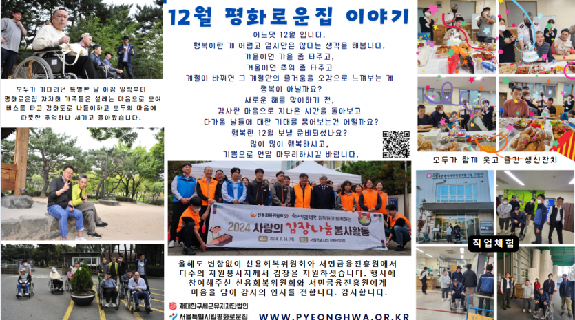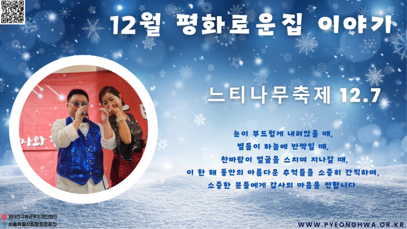 2024년 12월 후원감사편지 페이지 정보 작성자 장설궁 작성일 24-12-01 11:04 조회 5,735회 댓글 0건 본문 얼마전 첫눈이 내렸는데...그것도 엄청 많이..혹시 보셨나요?날씨도 갑자기 추워지고, 눈도 내리는 것이 본격적인 겨울이 왔나 봅니다.한 해가 가버린다고 아쉬워하기 보다는 아직 남아있는 시간들을 알차게 보내는 12월 되시길 바랍니다. 항상 건강하시고 행복하세요 이전글 다음글 목록