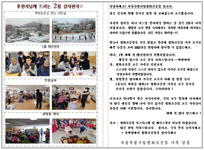 2022년 2월 후원자 감사편지 페이지 정보 작성자 김동현 작성일 22-02-07 14:21 조회 12,948회 댓글 0건 본문 2022년 2월, 겨울이 지나가고 봄이 오고 있습니다.항상 평화로운 집과 함께해주시는 후원자님들께감사의 편지를 올립니다. 이전글 다음글 목록