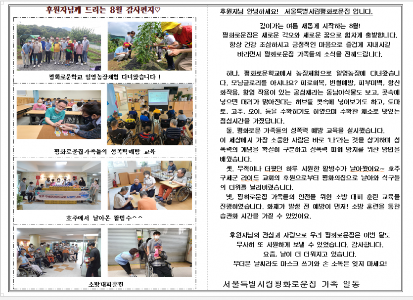 2022년 8월 후원자 감사편지 페이지 정보 작성자 장설궁 작성일 22-08-08 10:43 조회 11,894회 댓글 0건 본문 8월은 내가 나에게 휴식을 선물하는 의미 있는 달이였으면 좋겠습니다.새해를 열면서 다짐했던 것을 실천하고 있는 나에게 선물을 주는 8월!그 선물 속에는 가족과 친구가 있고 함께 지낸 사람들의 고마움도 담겨 있겠지요.시간은 빠르게 지나갑니다. 누구나 그러하듯이 또 다른 한 해를 향한 남은 시간도 더 빠르게 지나가겠지요 (●'◡'●)8월에 받은 선물이 가을과 겨울로 이어져서 행복이 될 수 있게 꿈이 담겼으면 좋겠습니다. 이전글 다음글 목록