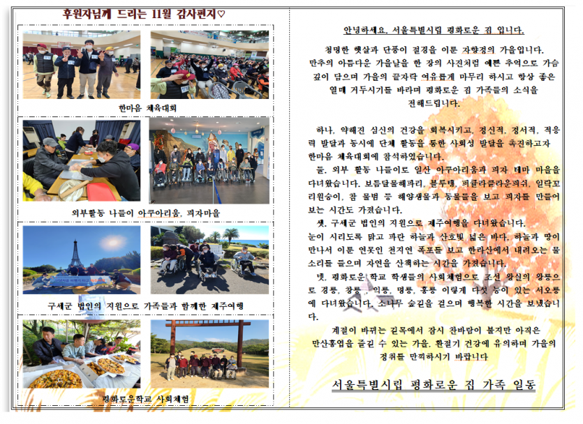 2022년 11월 후원감사편지 페이지 정보 작성자 장설궁 작성일 22-11-06 13:22 조회 10,973회 댓글 0건 본문 벌써 11월이네요.가을이 점점 깊어갑니다.화려했던 단풍들도 이제 낙엽이 되어 떨어지기 시작합니다.수북히 쌓인 낙엽길도 걸어보시면서..여유롭게 보내시면 좋겠습니다.11월도 건강하시고,하시는 모든일에 행운과 행복이 가득하시길 바랍니다.아자!아자! 화이팅! 이전글 다음글 목록