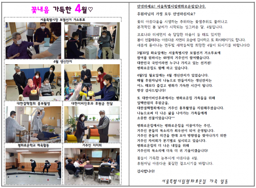 2021년 4월 후원자 감사편지 페이지 정보 작성자 박상은 작성일 21-04-07 09:40 조회 14,317회 댓글 0건 본문 2021년 4월, 활짝 핀 꽃들의 아름다움처럼 빛나는 후원자님의 나눔에 감사드립니다.늘 나눔으로 함께해주시는 후원자님께감사의 편지를 올립니다. 이전글 다음글 목록