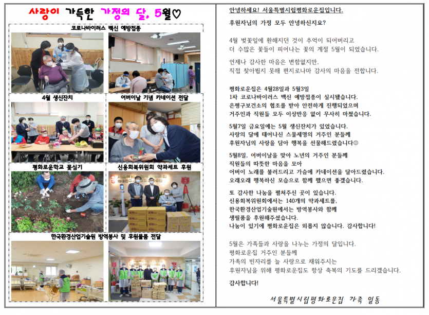 2021년 5월 후원자 감사편지 페이지 정보 작성자 박상은 작성일 21-05-17 17:55 조회 14,513회 댓글 0건 본문 5월은 꽃의 계절, 사랑의 계절..항상 사랑으로 함께 해주시는 후원자님의 나눔에 감사드립니다.늘 나눔으로 함께해주시는 후원자님께감사의 편지를 올립니다. 이전글 다음글 목록