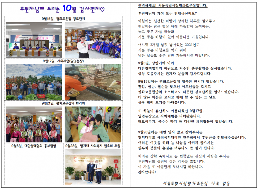 2021년 10월 후원자 감사편지 페이지 정보 작성자 박상은 작성일 21-11-18 10:04 조회 12,638회 댓글 0건 본문 청량한 하늘이 아름다운 10월,후원자님께 감사의 편지를 올립니다. 이전글 다음글 목록