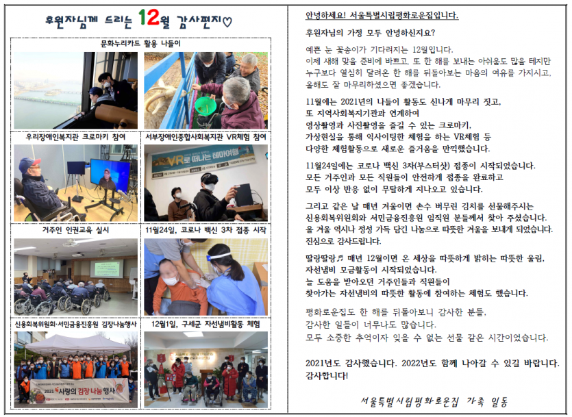 2021년 12월 후원자 감사편지 페이지 정보 작성자 박상은 작성일 22-01-05 17:31 조회 12,517회 댓글 0건 본문 크리스마스캐롤 울려퍼지는 아름다운 겨울입니다.12월, 후원자님께 감사의 편지를 올립니다. 이전글 다음글 목록
