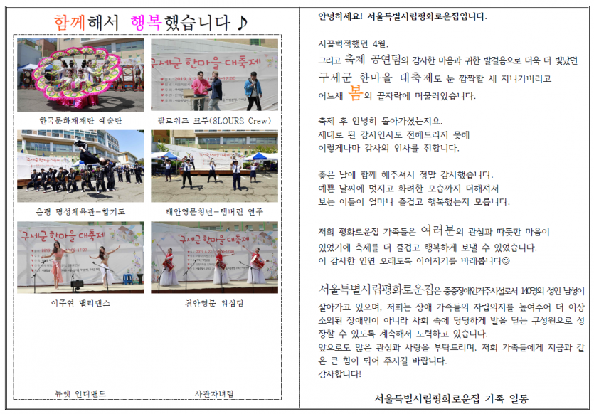 2019년 4월 연합축제 공연팀 감사편지 페이지 정보 작성자 박상은 작성일 20-09-11 11:50 조회 13,580회 댓글 0건 본문 첫 실시된 3개시설 연합축제에 귀한 발걸음 해주시고멋진 공연을 선물해주신 관계자 분들께감사의 편지를 올립니다. 이전글 다음글 목록