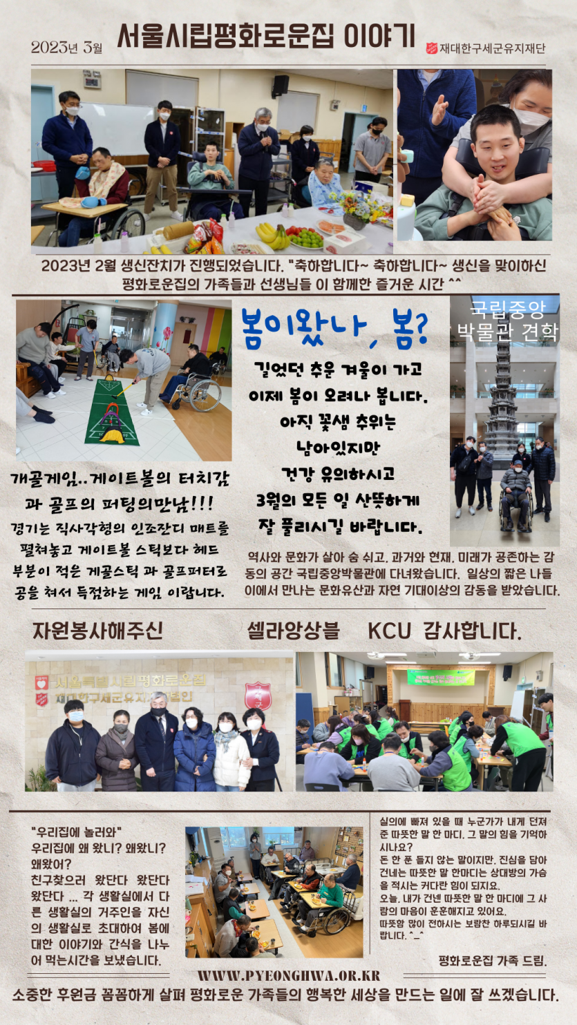 2023년 3월 후원감사편지 페이지 정보 작성자 장설궁 작성일 23-03-01 11:29 조회 10,758회 댓글 0건 본문 3월 첫날이 되었습니다. 봄맞이 준비는 잘 하셨나요? 아직은 아침 저녁으로 쌀쌀한 찬 공기가 있으니 건강에 유의하시기 바랍니다.2023년 3월 봄에는 꼭 봄을 마음껏 즐기시며 보내셨음 합니다. ^^ 이전글 다음글 목록
