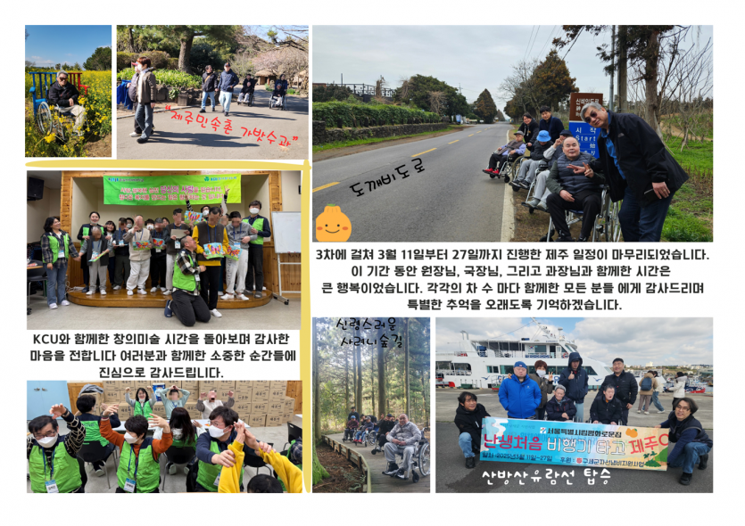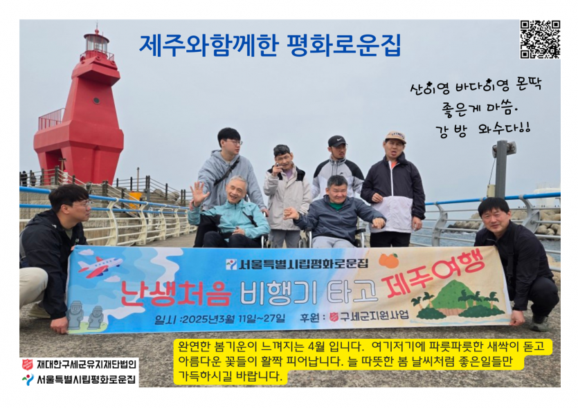 2025년 시립평화로운집 4월 후원 감사 편지 페이지 정보 작성자 장설궁 작성일 25-04-01 11:43 조회 4,432회 댓글 0건 본문 따뜻한 봄의 기운이 가득한 4월, 여러분의 사랑과 후원에 진심으로 감사드립니다.3월에 제주도에서 새로운 경험을 하였습니다. 다양한 문화와 아름다운 자연환경을 경험하며 새로운 영감을 얻는 시간이었습니다. 여러분의 관심과 사랑으로, 우리는 더 큰 꿈을 향해 나아갈 수 있습니다. 여러분의 지속적인 사랑과 후원에 감사드리며, 우리가 함께하는 이 여정에서 더 큰 성과를 이루기를 기대합니다.진심으로 감사드립니다. 이전글 다음글 목록